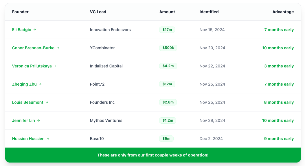 In just two weeks after launching this newsletter, we identified founders who went on to raise $40m over the next year, and we’ve continued to provide valuable signal on early stage founders since.