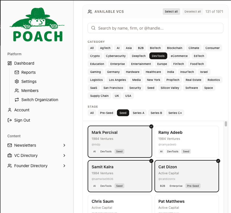 You can now select any segment of of VC Twitter accounts (for example “pre-seed” and “robotics”) or provide your own list. Starting the next morning, you’ll get a daily Poach-style summary of the founders those accounts follow, along with an attached CSV of all the raw data.